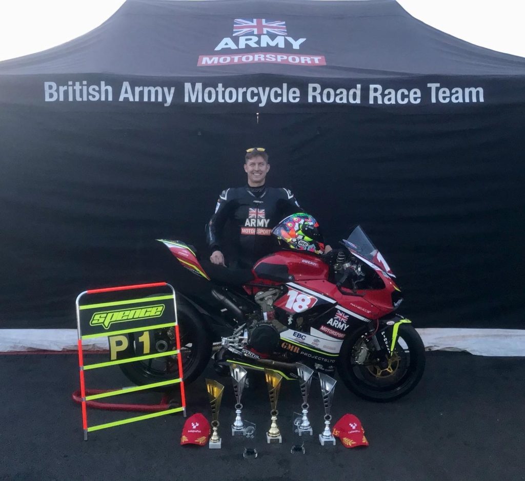 “Then to the Inter Services Road Racing Championships in Thundersport GB racing for ARMY Motorcycle Road Race Team. It’s been a great season, winning four of the five races and only losing the last race by 0.1 second over the line – this was one of my races of the season! Coming away with the GBRacing World Class Motorcycle Protection Interservice Individual Championship was a great result.”